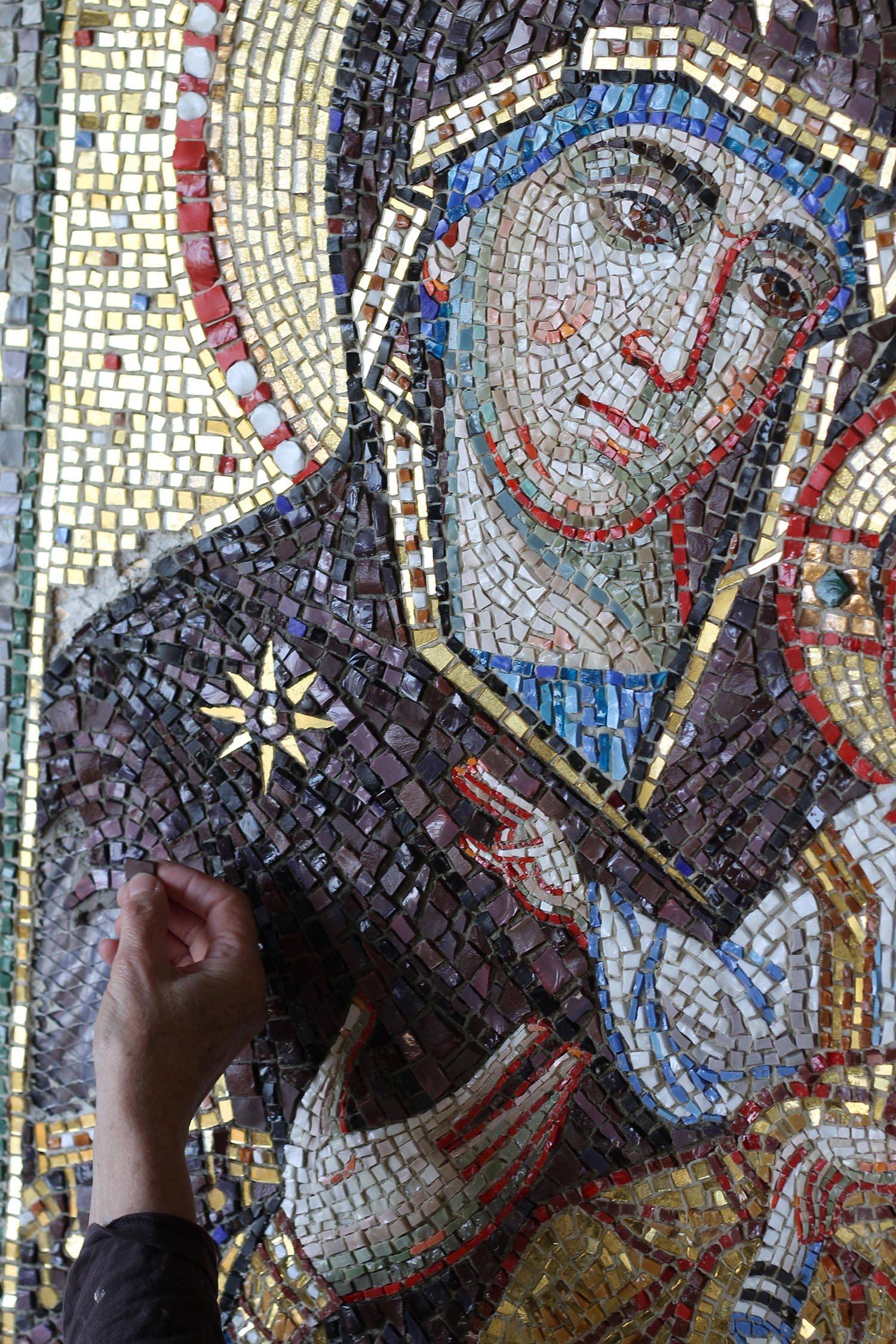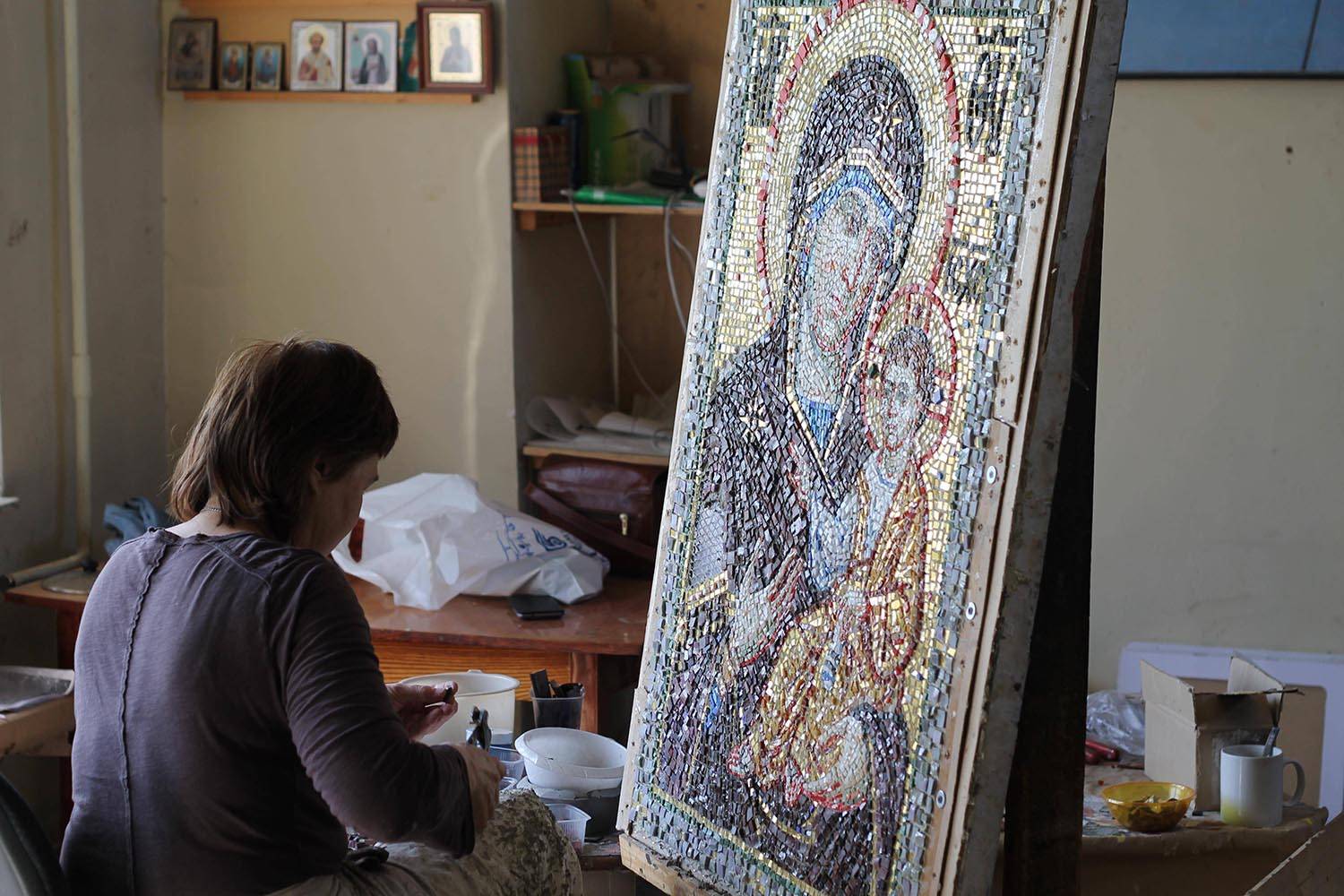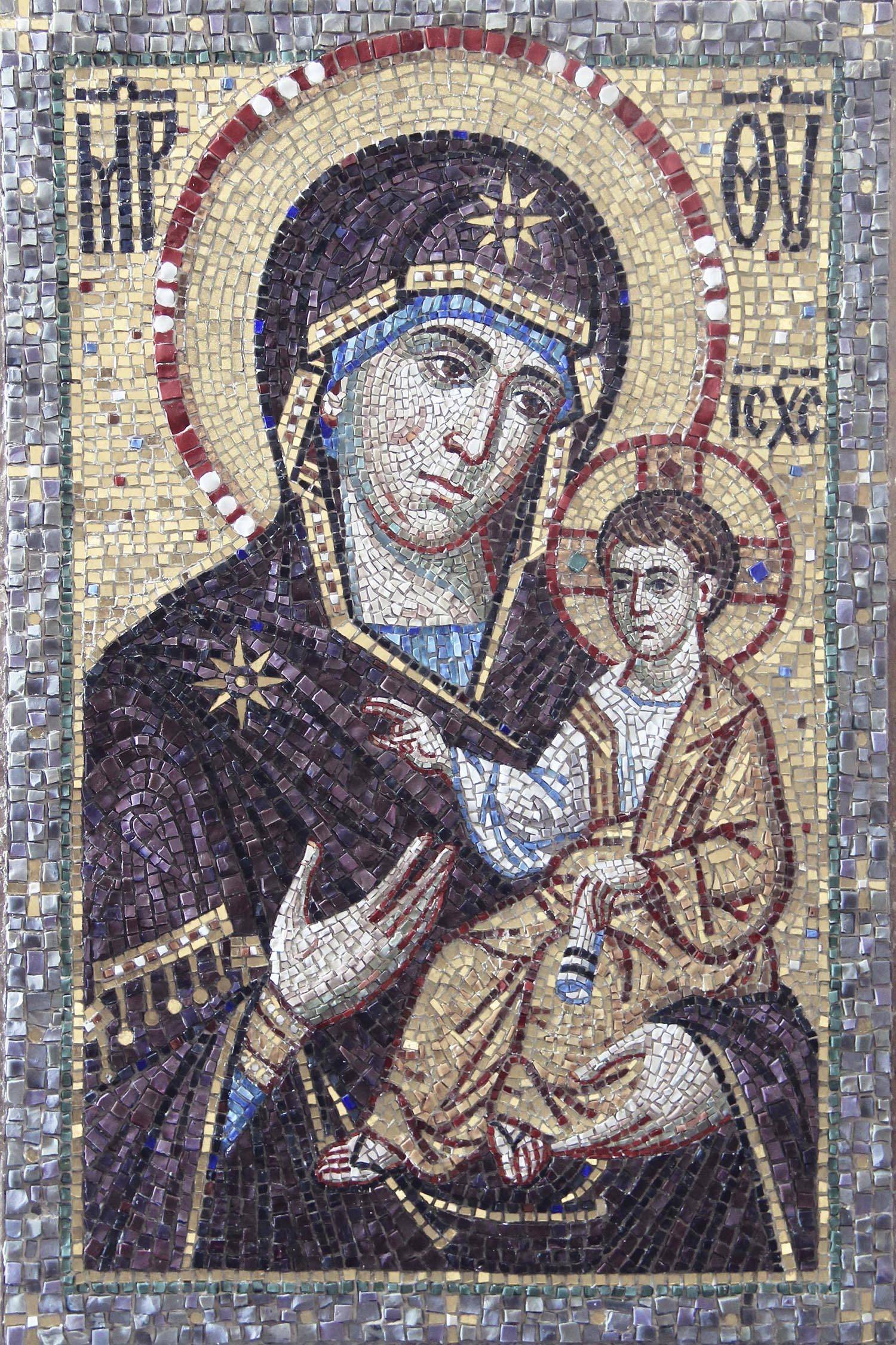 Мозаичный образ «Богоматерь Иверская» установлен на фасаде отдельно стоящего здания рядом с храмом. Автор мозаики — А. Носенко.
