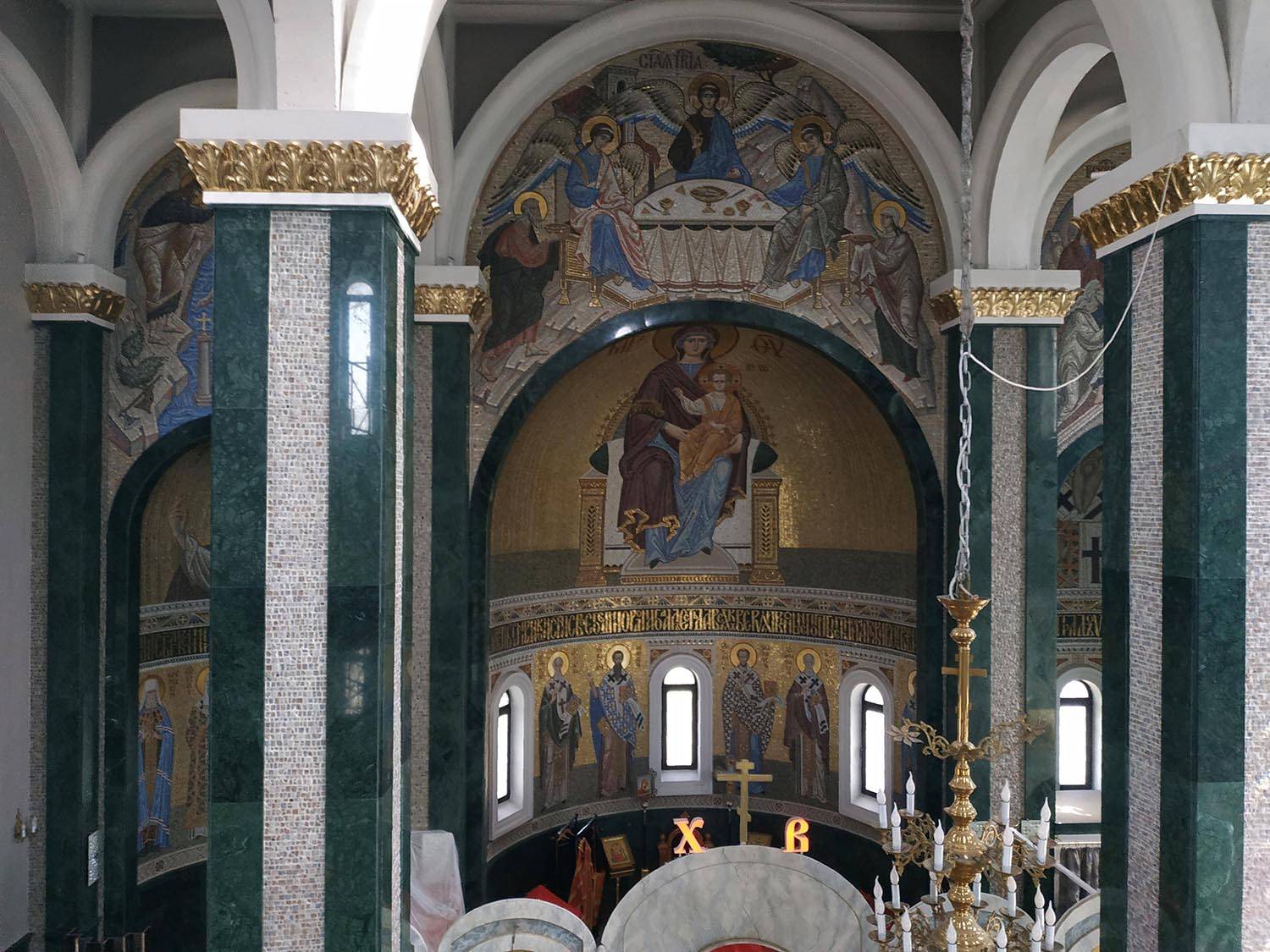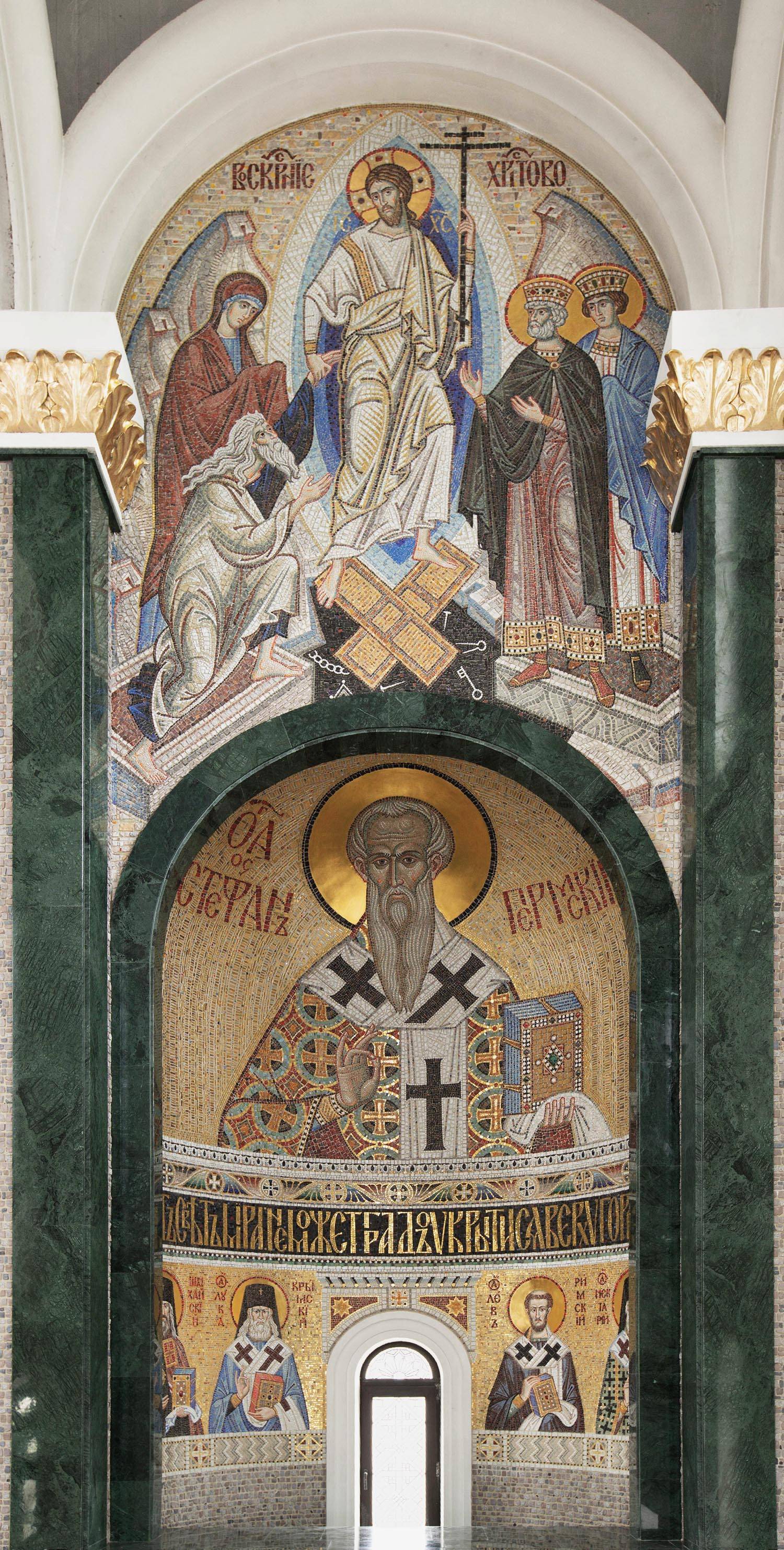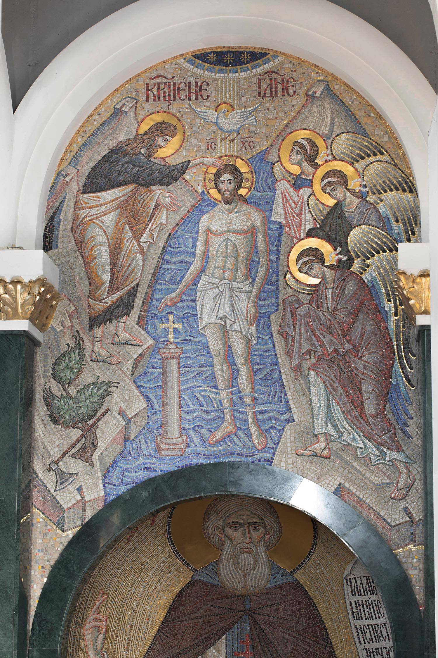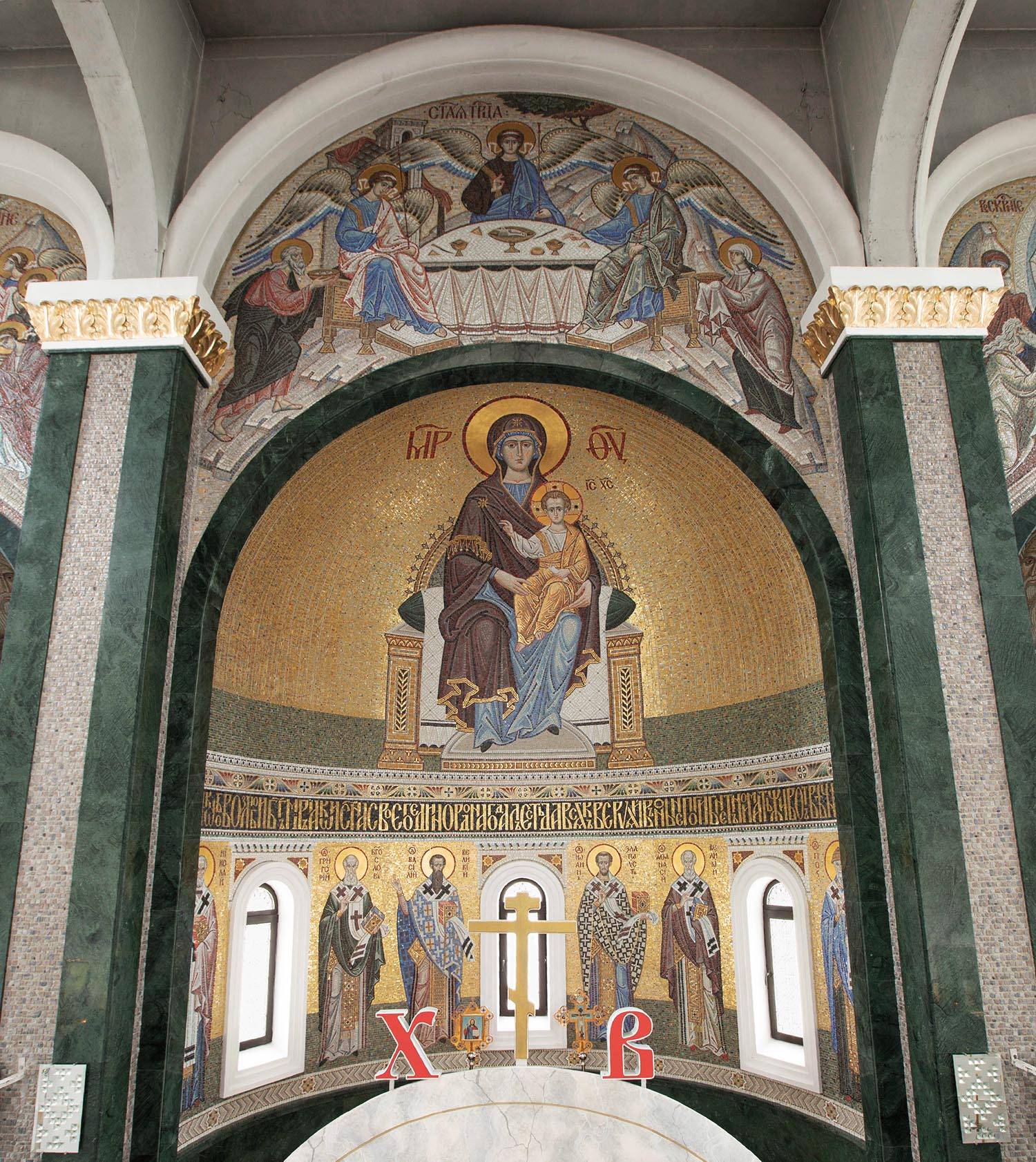 Работы по созданию мозаичного убранства алтарной части велись с 2015 по 2021 год. Проект интерьера, включая архитектурное решение, разработан Д. Римшей. Эскизы мозаик — А. Проценко. Мозаики выполнялись поэтапно, по мере поступления средств. Основной акцент был сделан на трёх алтарных конхах. В центральной размещена композиция «Богоматерь с Младенцем на троне», а в боковых — образы святых Сергия Радонежского и Стефана Пермского. Выше, на восточной стене, расположены сюжеты «Крещение», «Троица» и «Сошествие во ад». Мозаики апсид собраны на золотом фоне, что создаёт эффект сияния и гармонично сочетается с мраморным убранством храма.