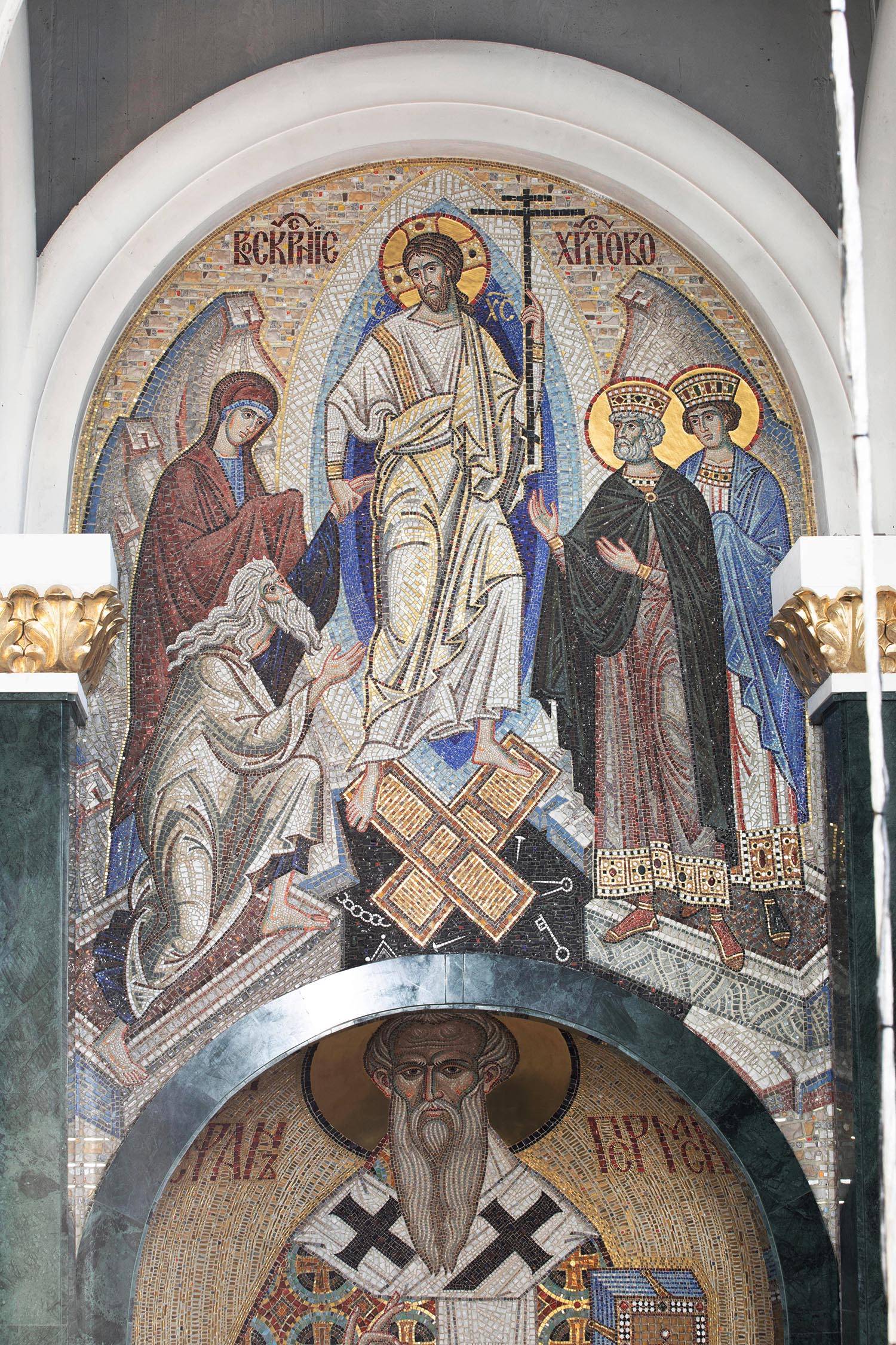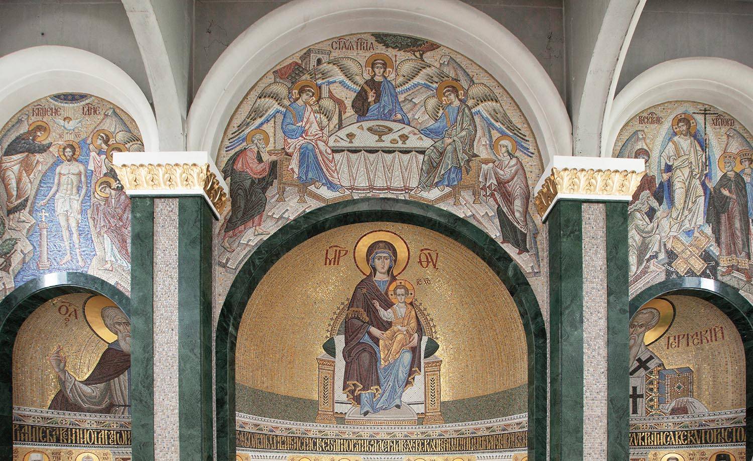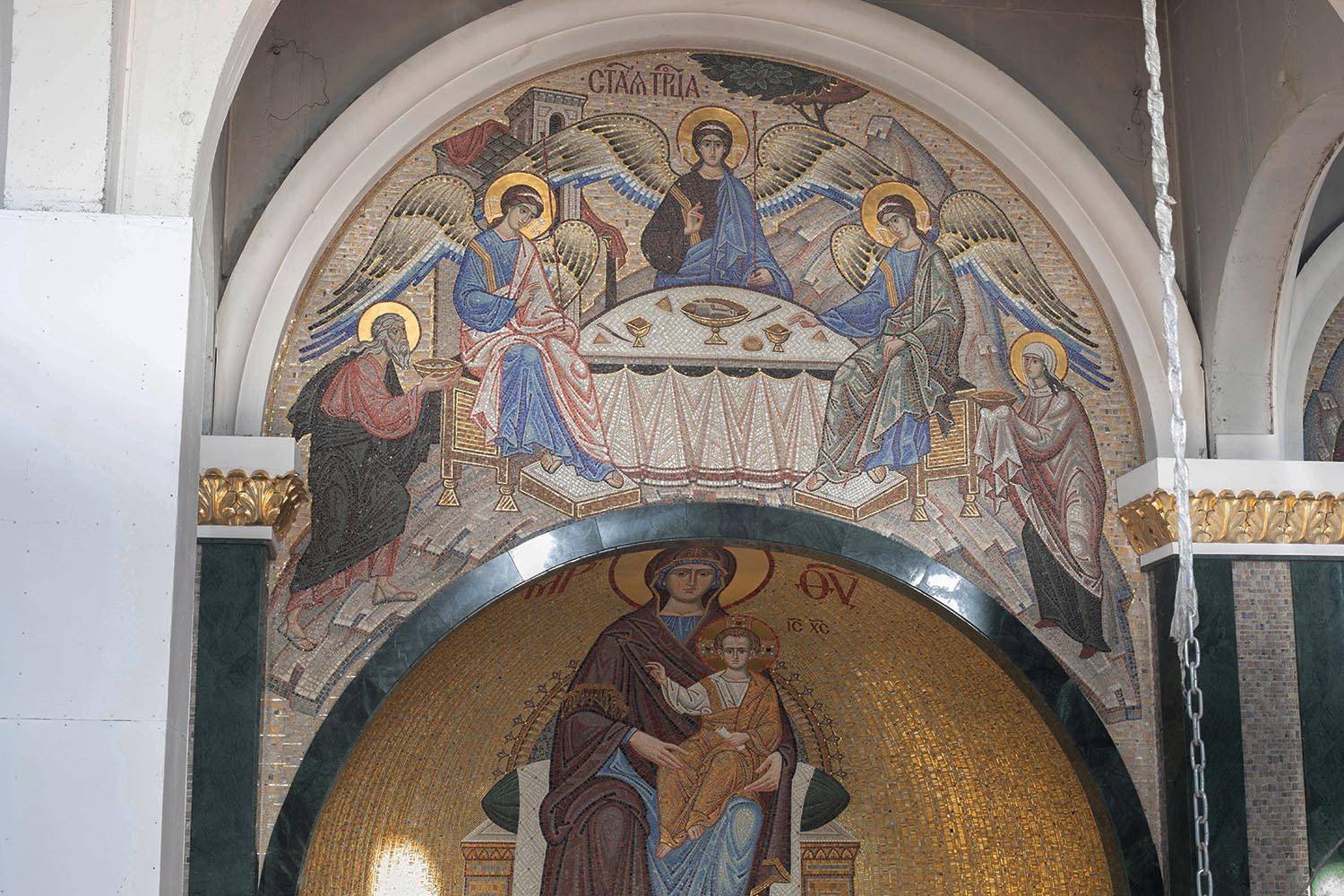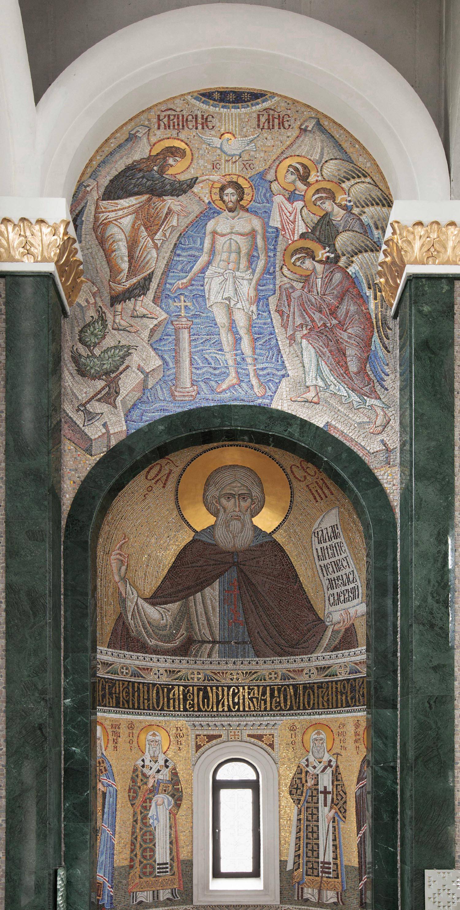 Работы по созданию мозаичного убранства алтарной части велись с 2015 по 2021 год. Проект интерьера, включая архитектурное решение, разработан Д. Римшей. Эскизы мозаик — А. Проценко. Мозаики выполнялись поэтапно, по мере поступления средств. Основной акцент был сделан на трёх алтарных конхах. В центральной размещена композиция «Богоматерь с Младенцем на троне», а в боковых — образы святых Сергия Радонежского и Стефана Пермского. Выше, на восточной стене, расположены сюжеты «Крещение», «Троица» и «Сошествие во ад». Мозаики апсид собраны на золотом фоне, что создаёт эффект сияния и гармонично сочетается с мраморным убранством храма.