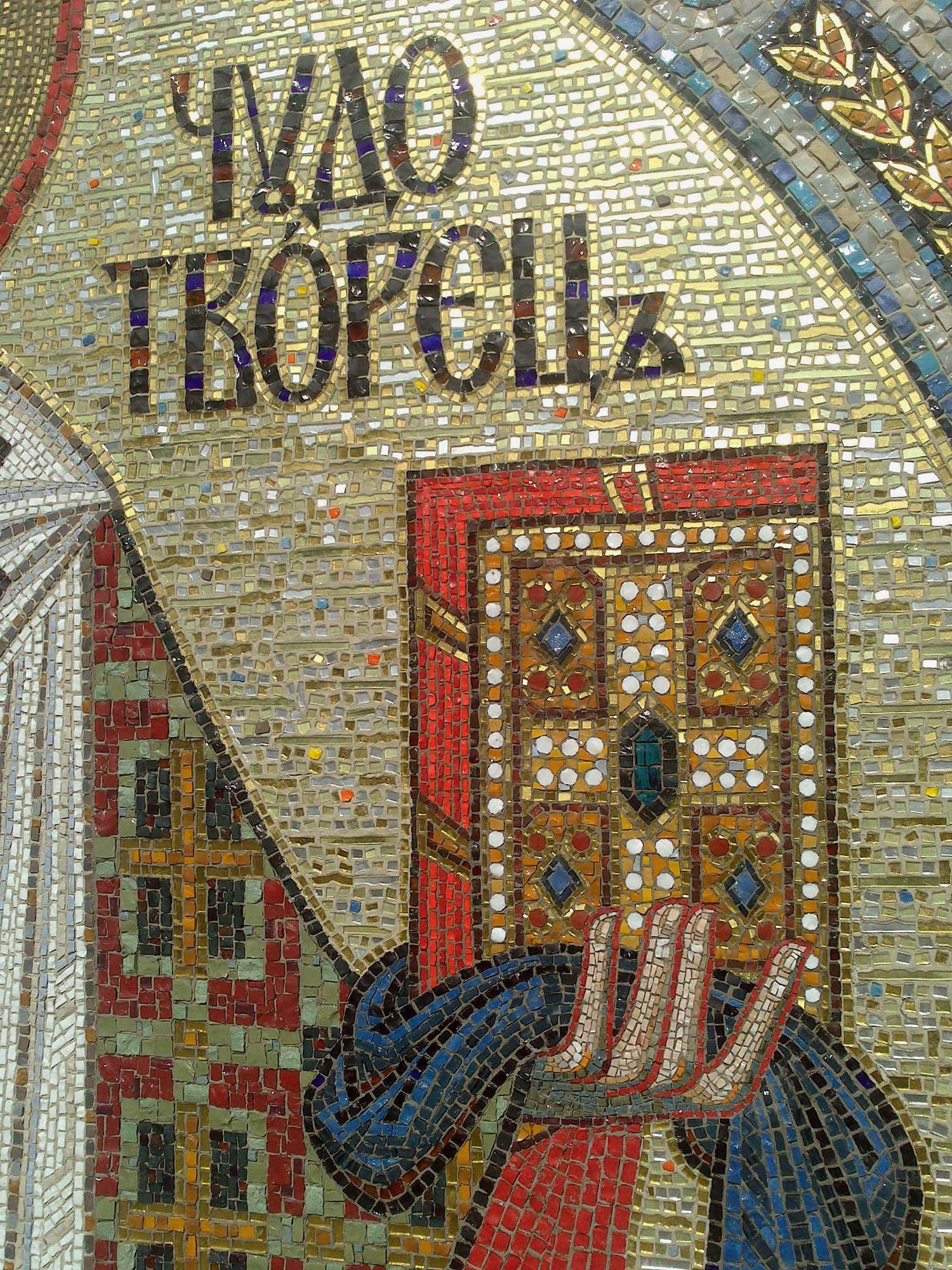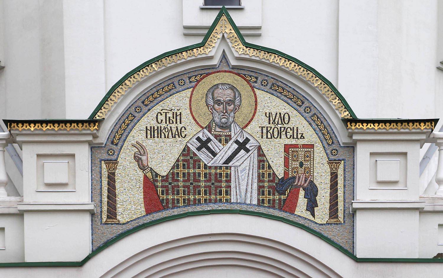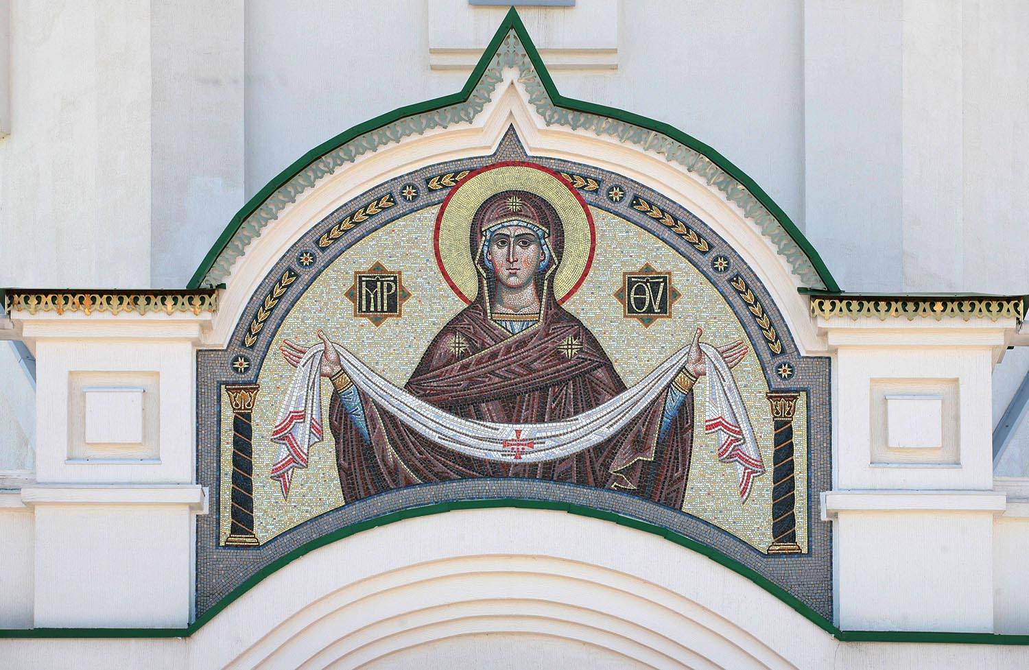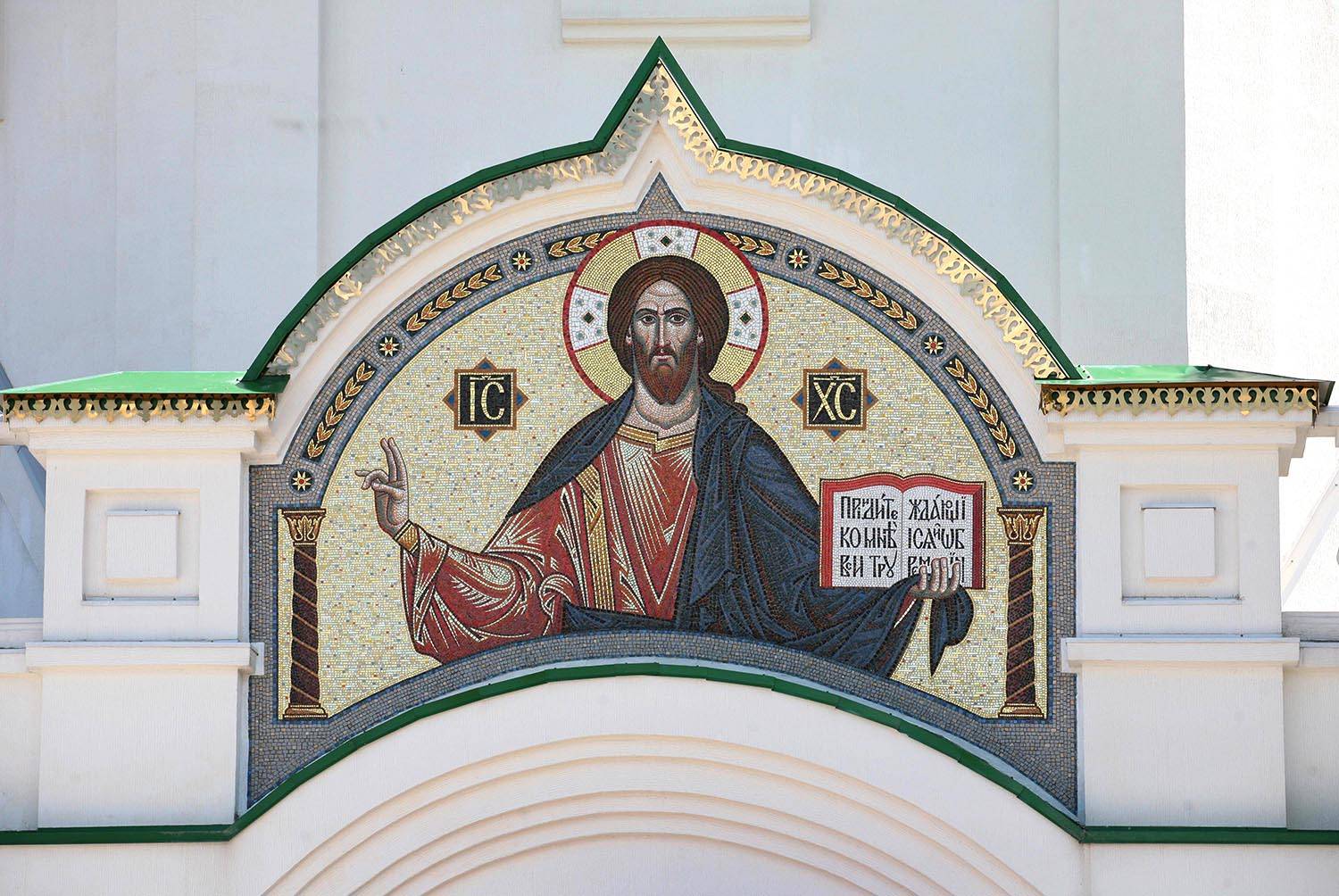 На фасадах храма размещены три крупные мозаичные иконы: Спас, Никола и Богородица. Особенностью работ стало использование серебристо‑золотистых фонов. Эскизы мозаик разработаны А. Носенко.