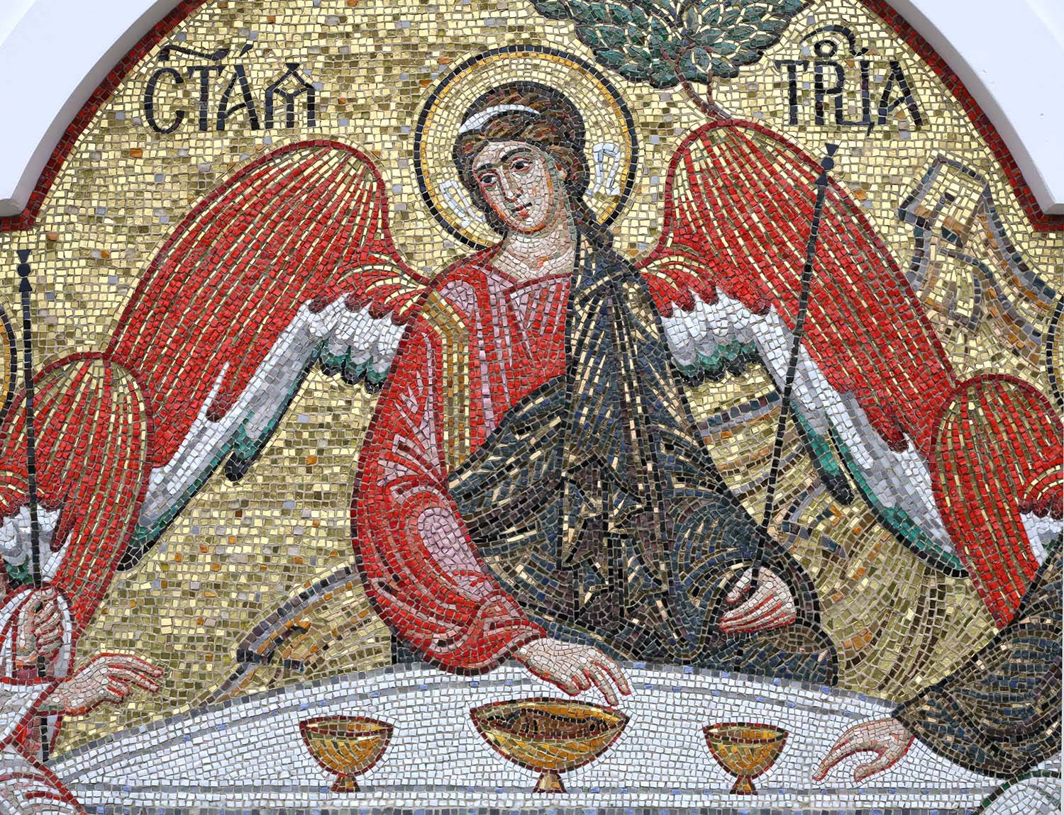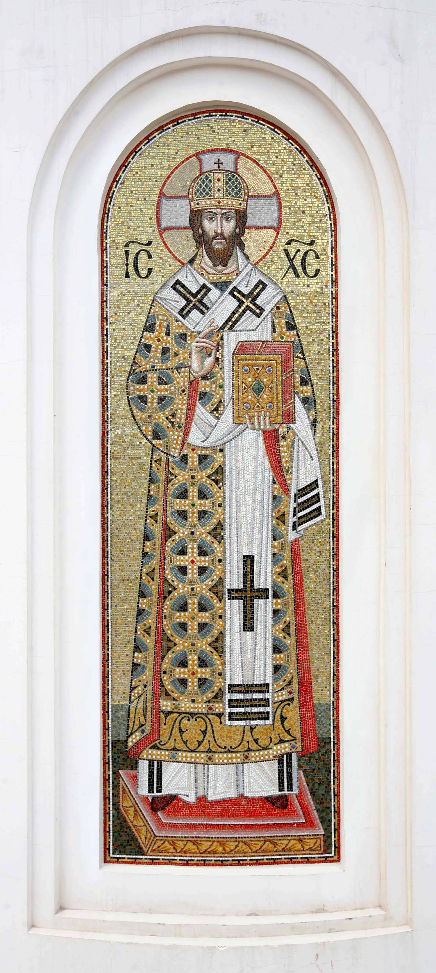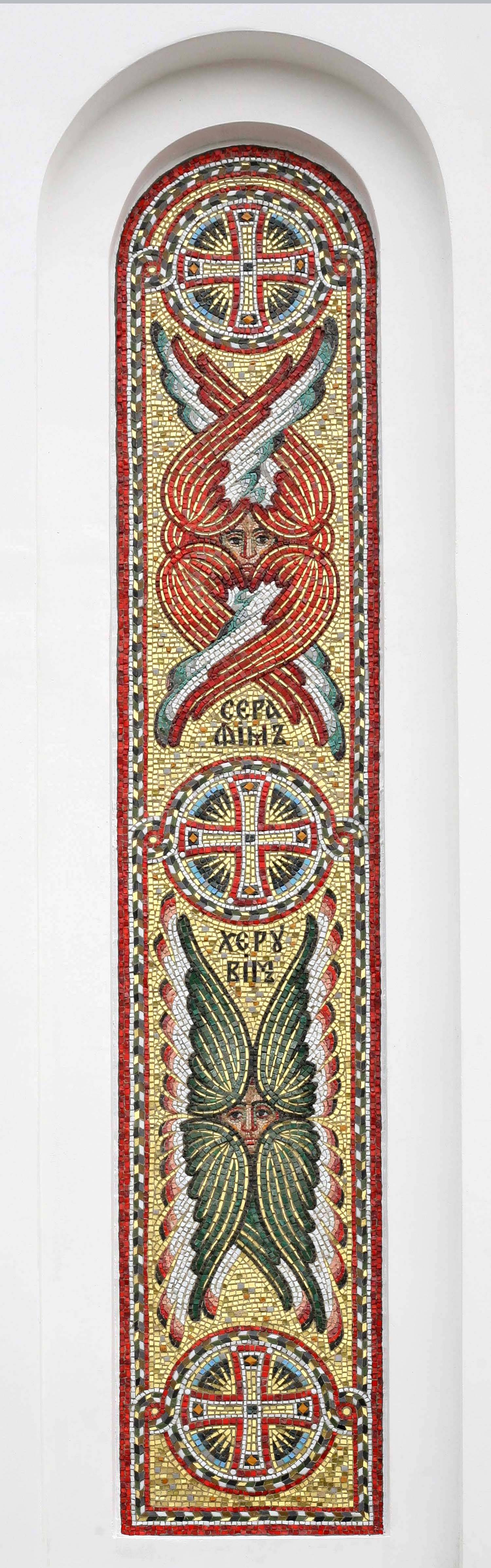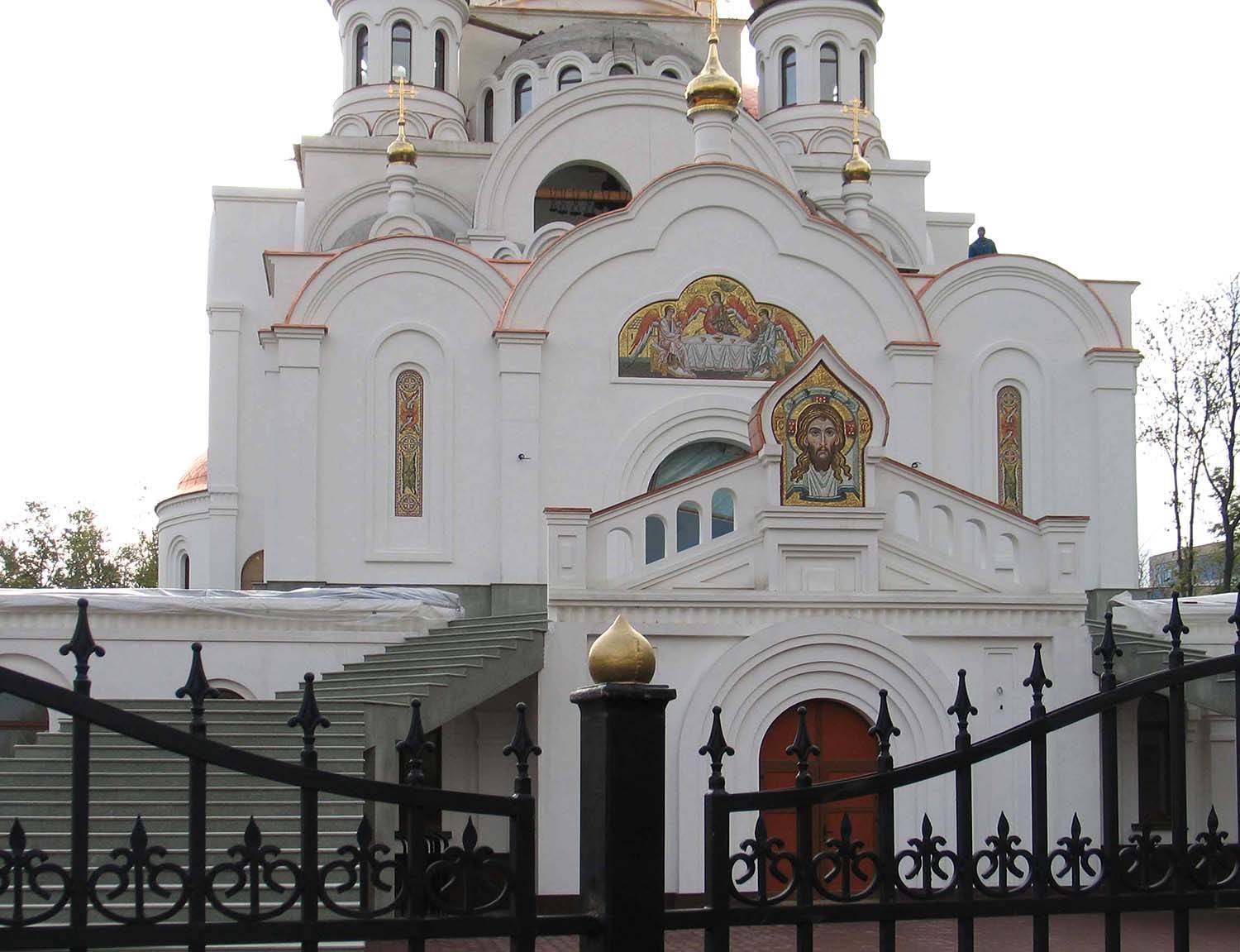 На фасадах храма размещены мозаичные композиции, созданные на золотом фоне. Нашей бригадой выполнены ключевые сюжеты: «Троица Живоначальная» над центральным входом, орнаментальные панно по её сторонам и «Спас Великий Архиерей» на алтарной части. Эскизы для работ разработаны А. Проценко.