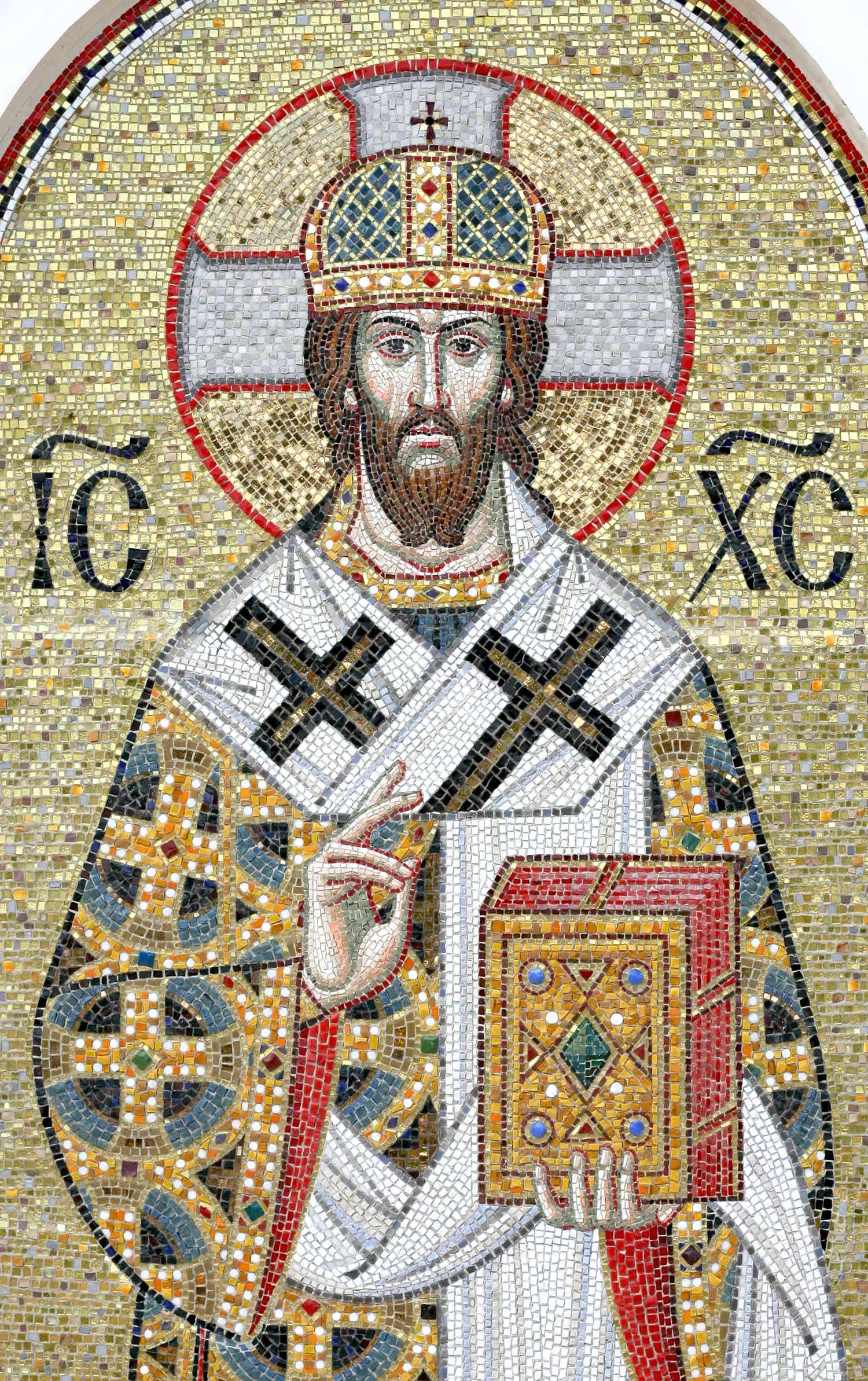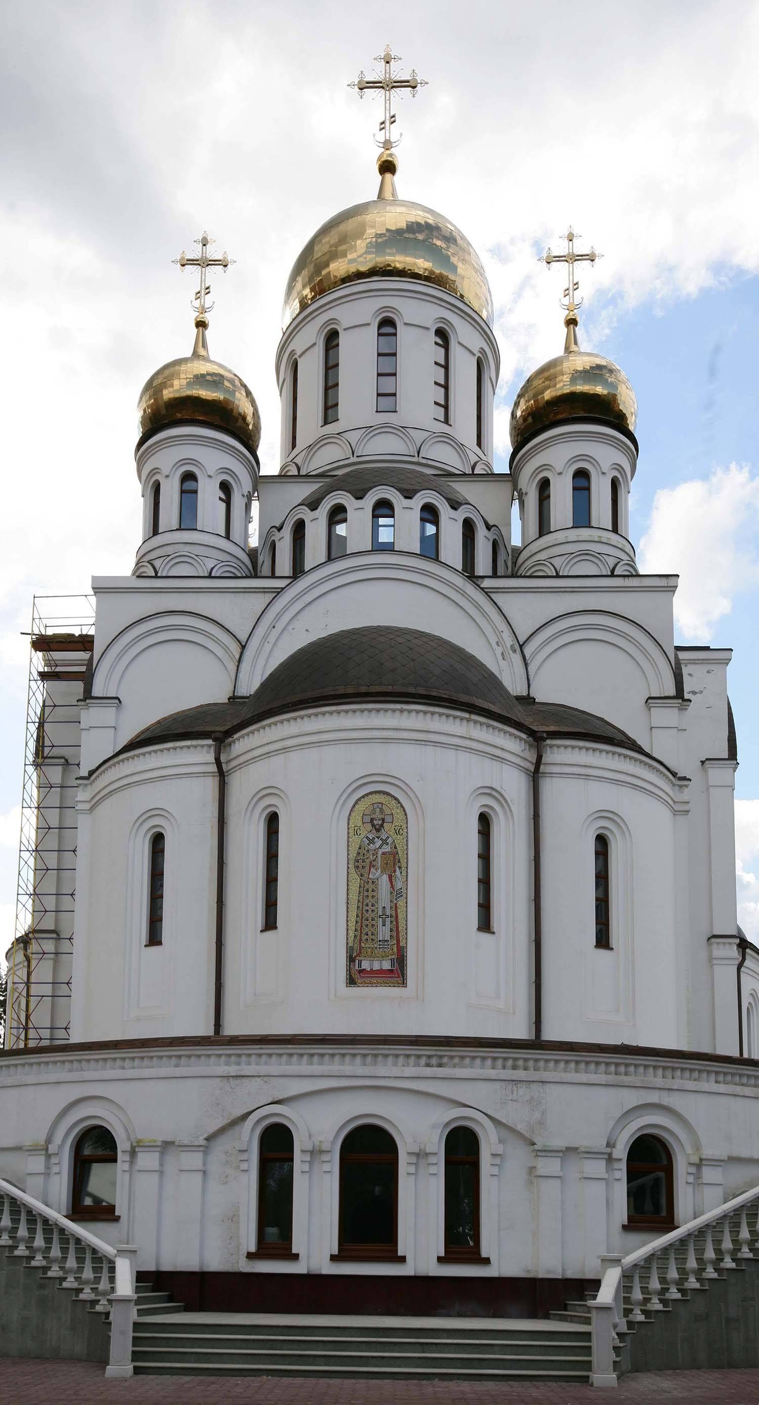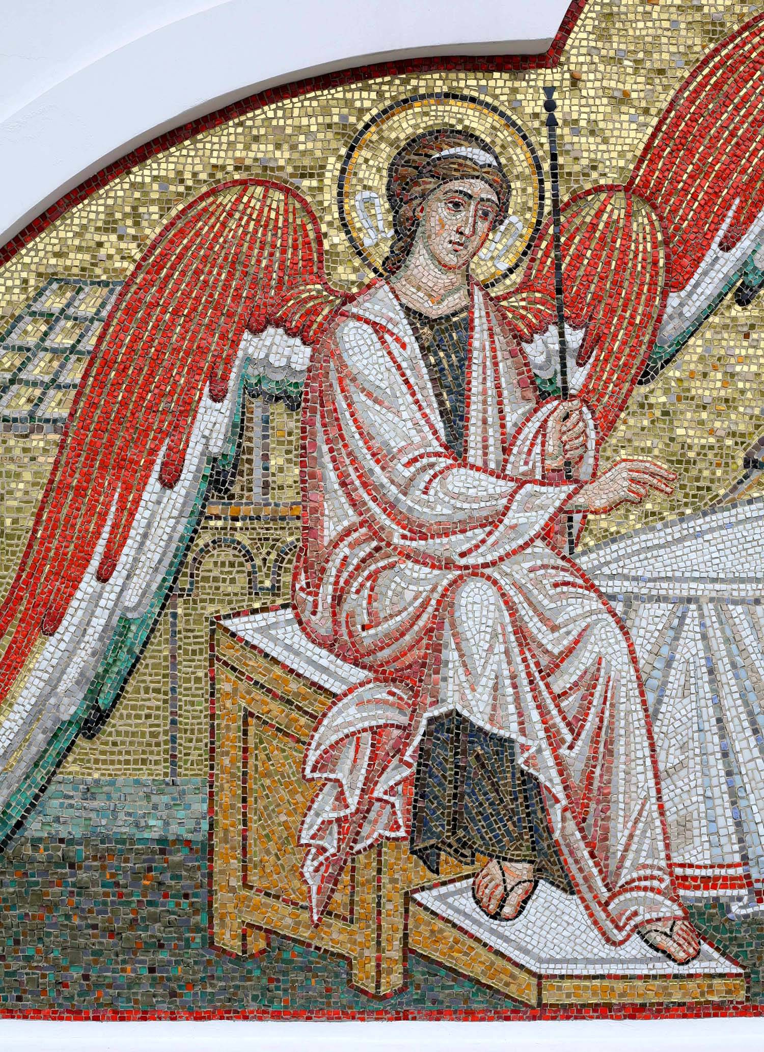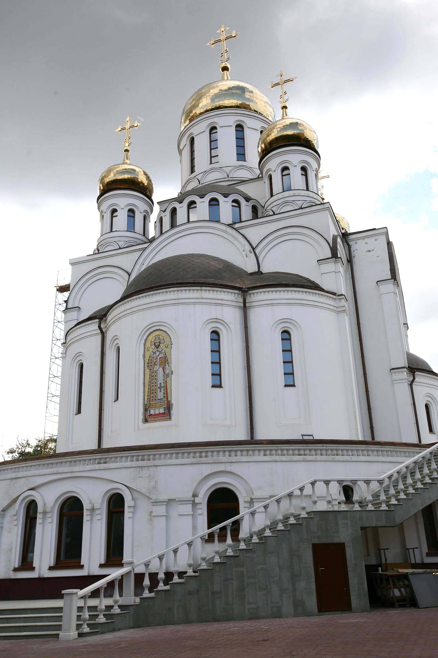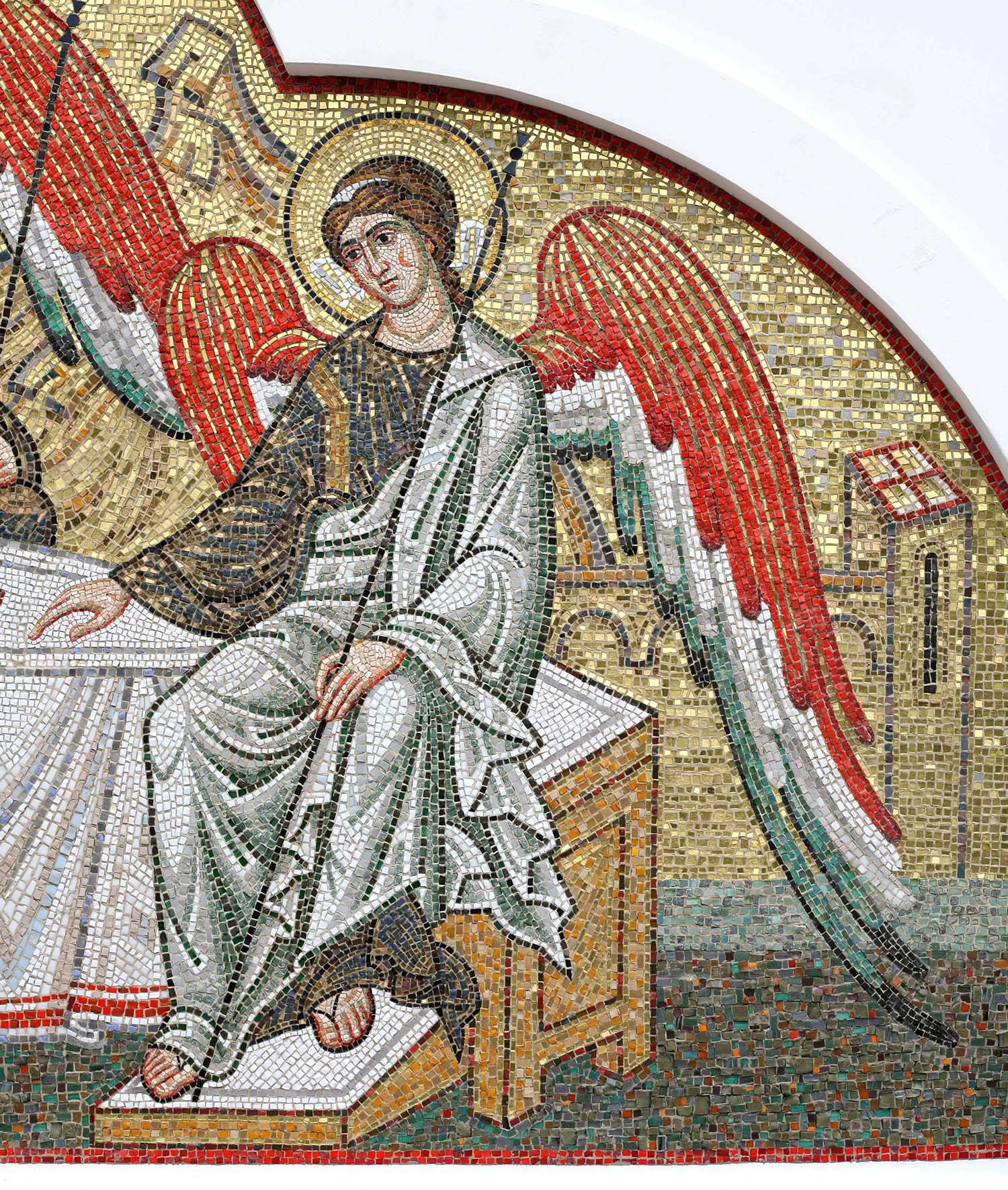 На фасадах храма размещены мозаичные композиции, созданные на золотом фоне. Нашей бригадой выполнены ключевые сюжеты: «Троица Живоначальная» над центральным входом, орнаментальные панно по её сторонам и «Спас Великий Архиерей» на алтарной части. Эскизы для работ разработаны А. Проценко.