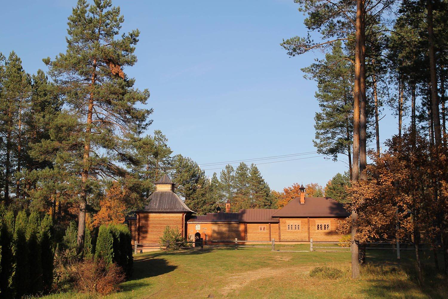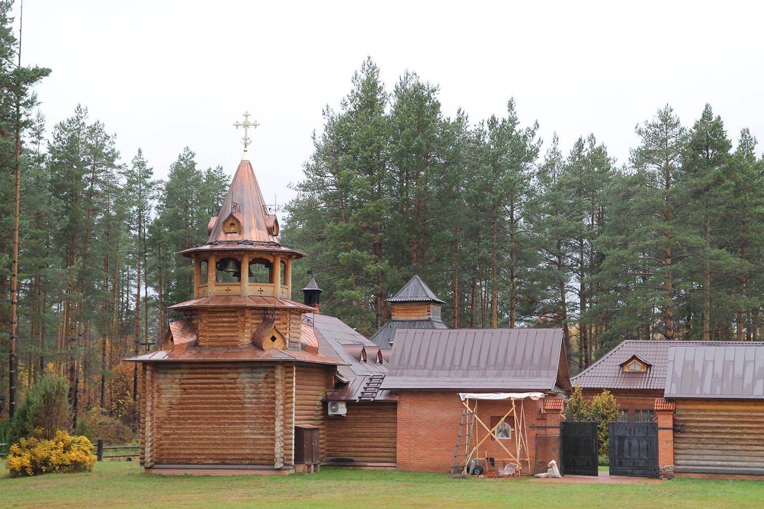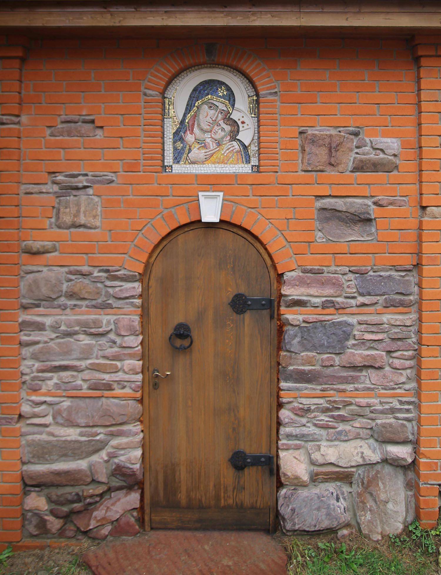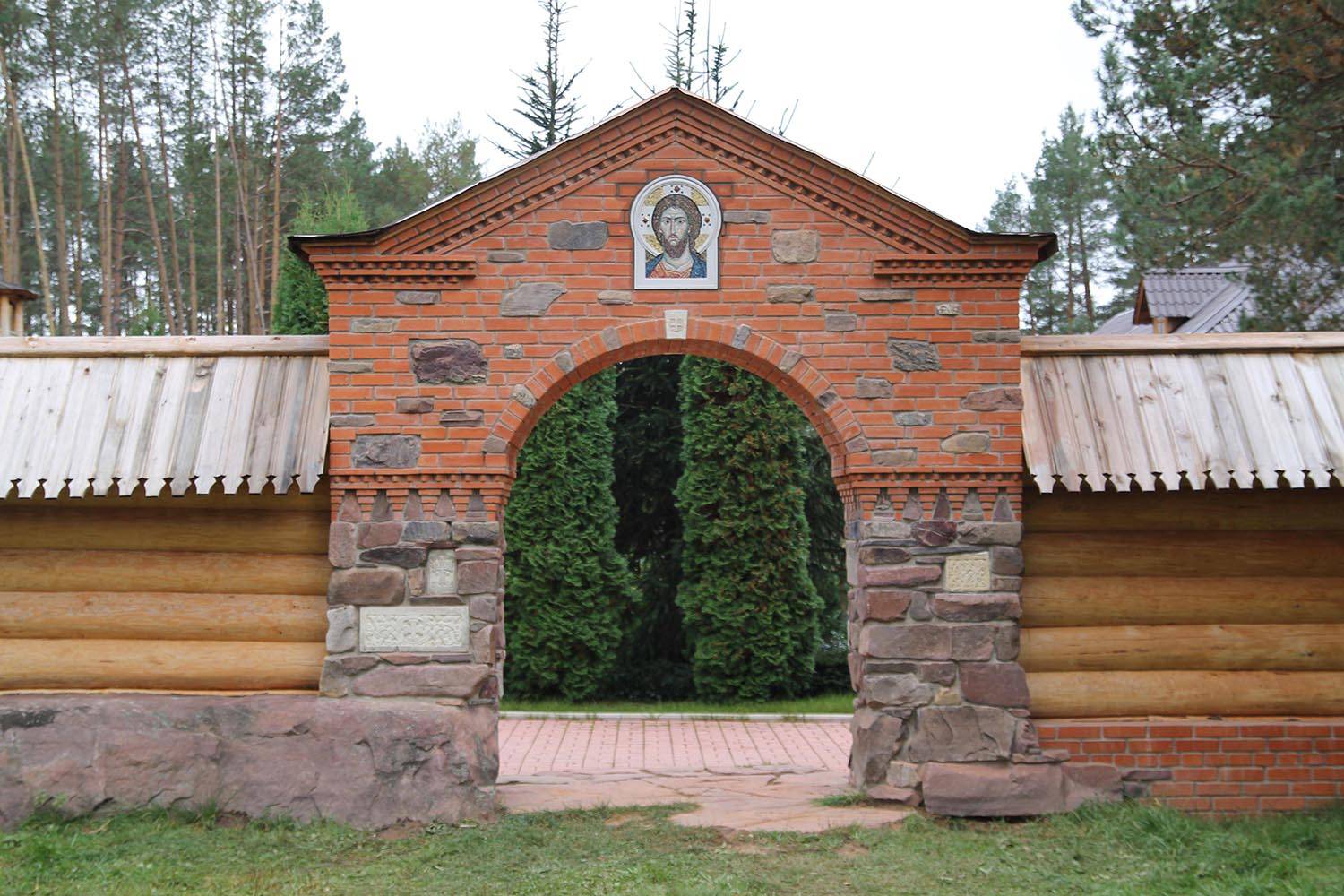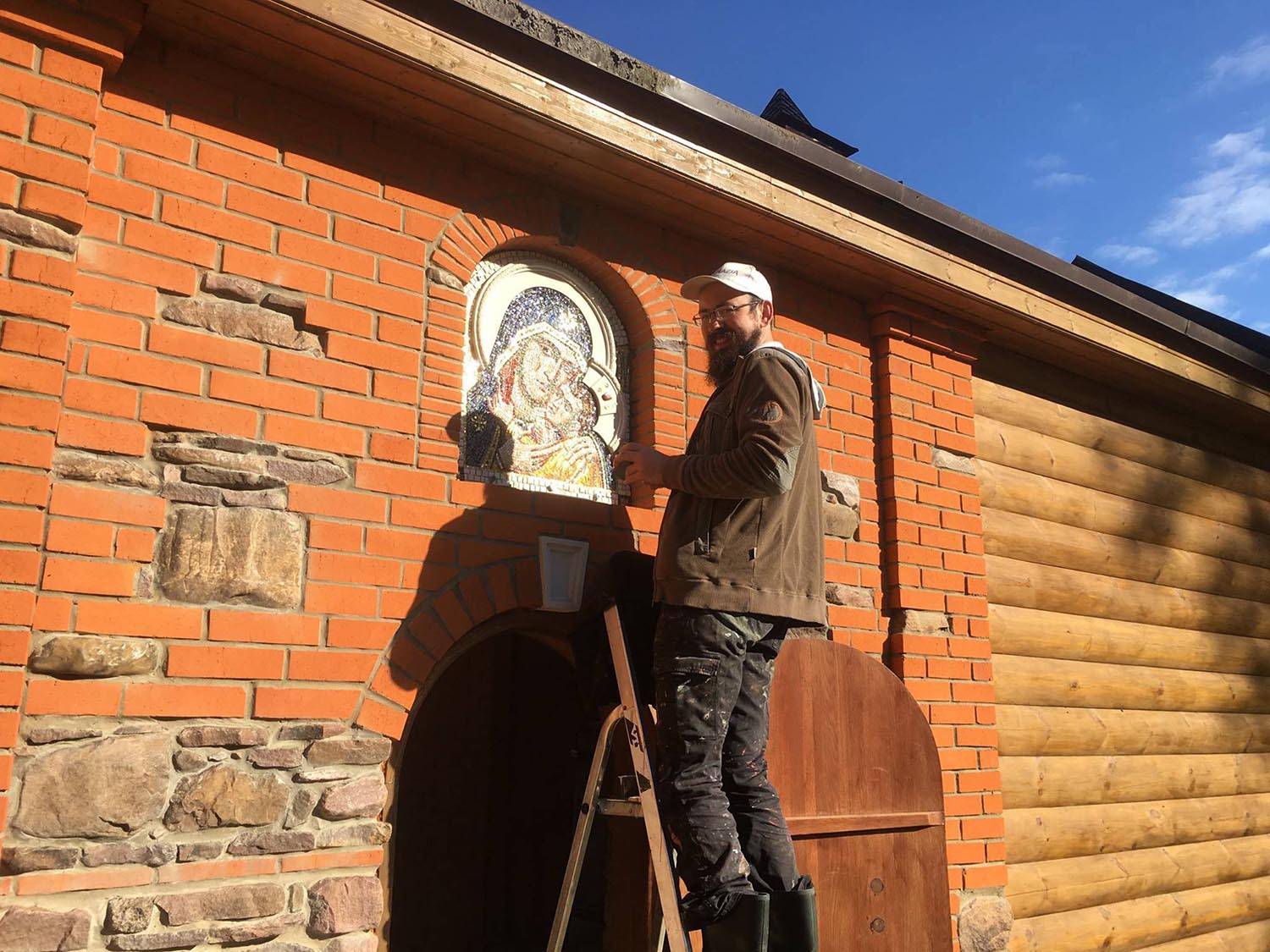 Скит, вдохновленный афонскими традициями, сочетает деревянную архитектуру с местным природным камнем. Для его убранства были созданы мозаичные иконы, интегрированные в каменные основания: рама и нимб становятся частью самой композиции. Образы «Богоматери Иверской» и «Сергия Радонежского» — автор А. Носенко. Образ «Спас оплечный» — автор А. Проценко.